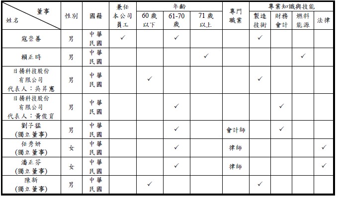 董事會成員皆為本國藉;女性成員占比為25%;成員年齡分布區間計有1名成員位於71-80 歲、5名成員年齡位於61-70歲及2名成員位於60歲以下。未來仍就視董事會運作、營運型態及發展需求適時增修多元化政策,包括但不限於基本條件與價值、專業知識與技能等二大面向之標準,以確保董事會成員應普遍具備執行職務所必須之知識、技能及素養。