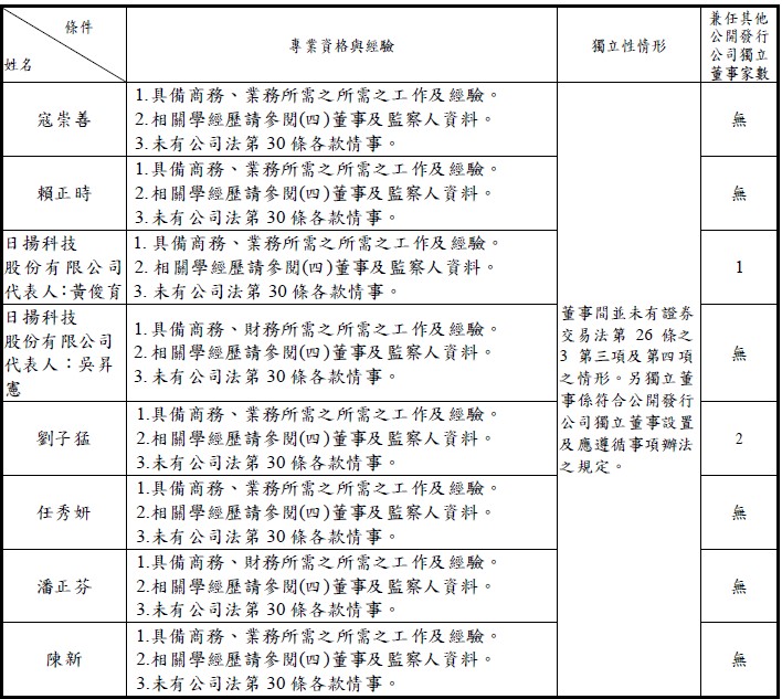 衡諸本公司目前董事會8名董事成員(含4名獨立董事),整體具備營業判斷及業務開發、會計及財務分析、經營管理及服務研發、風險管理及危機處理、產業知識、國際市場觀、領導決策暨環境永續及法務等多元能力及經驗。
